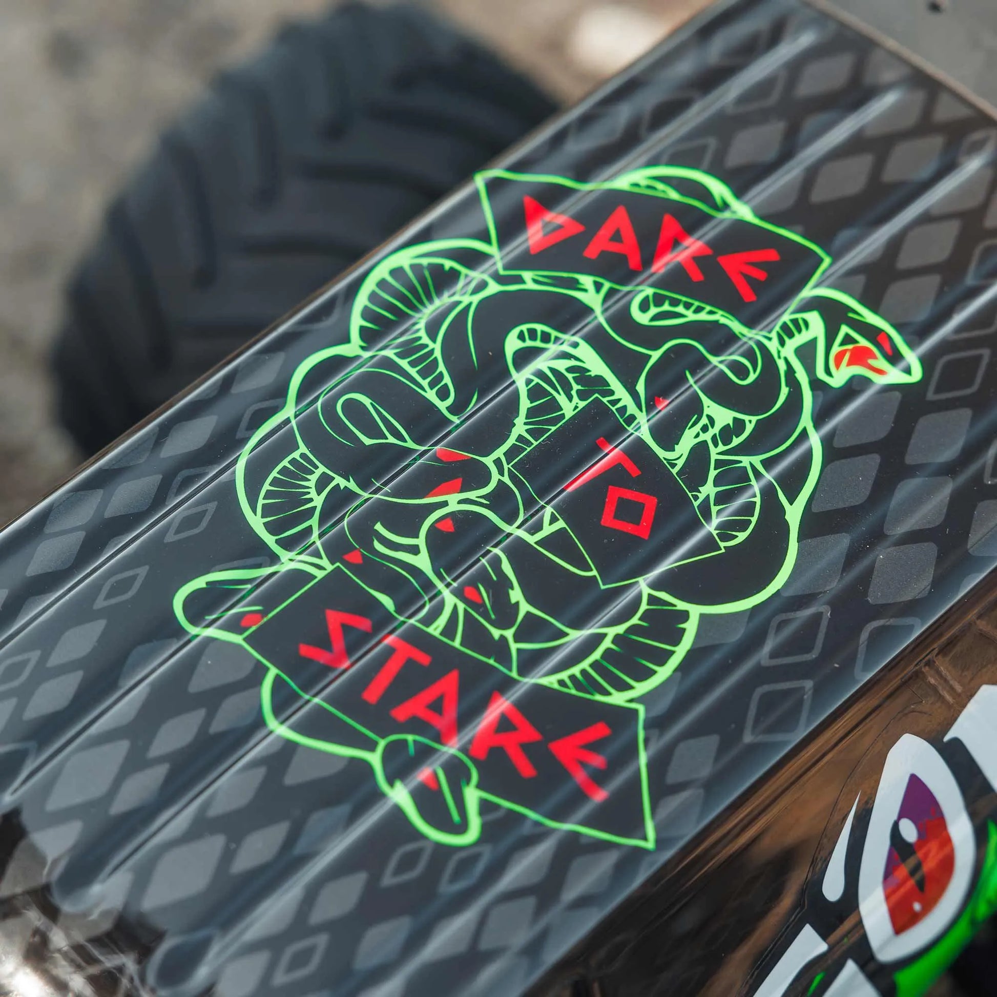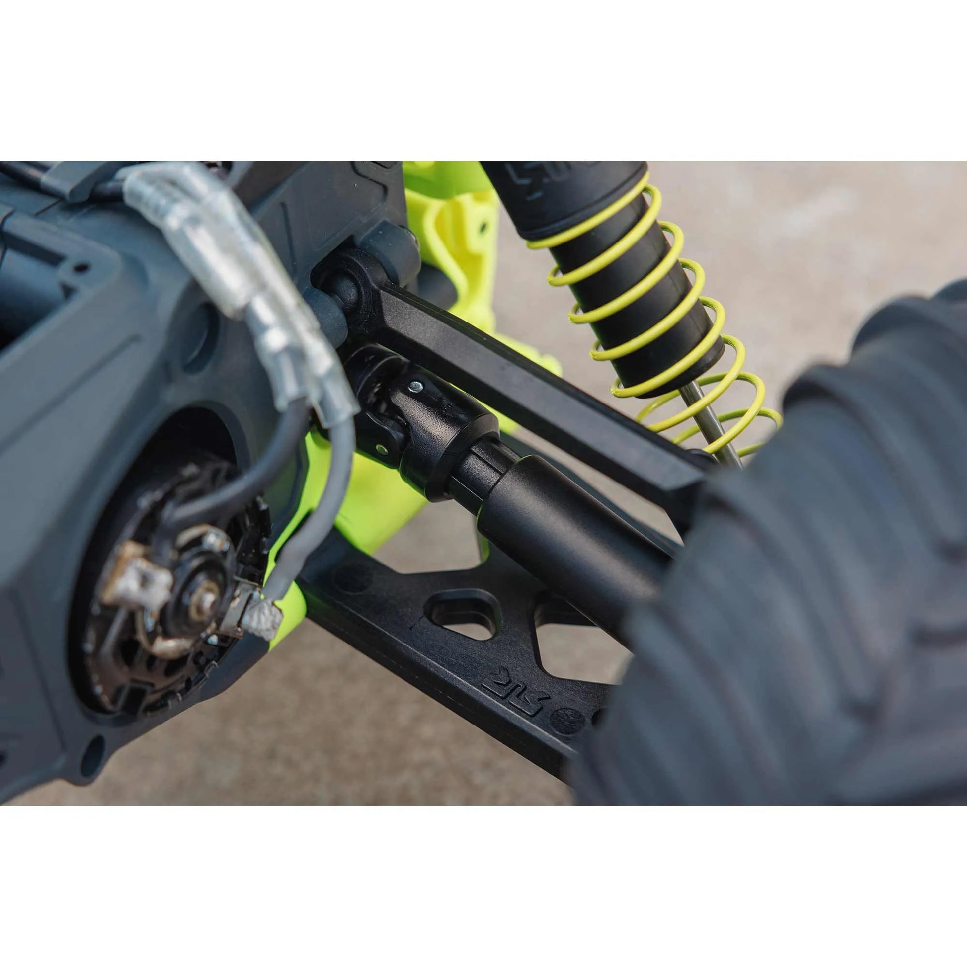 The Arrma Gorgon MT 2WD commands attention straight out of the box with its captivating trim scheme. Its “fang-tastic” distinctive design sets it apart, making a bold statement before the action begins. The body comes factory-finished in your choice of red or fluorescent yellow, with colour-coordinated skid plates, battery tray, shock springs and front and rear bumpers that resist impacts and help protect those graphics. But this monster truck is not just about looks; it's built to endure harsh bashing adventures thanks to Arrma’s proven engineering and strong spine composite chassis.