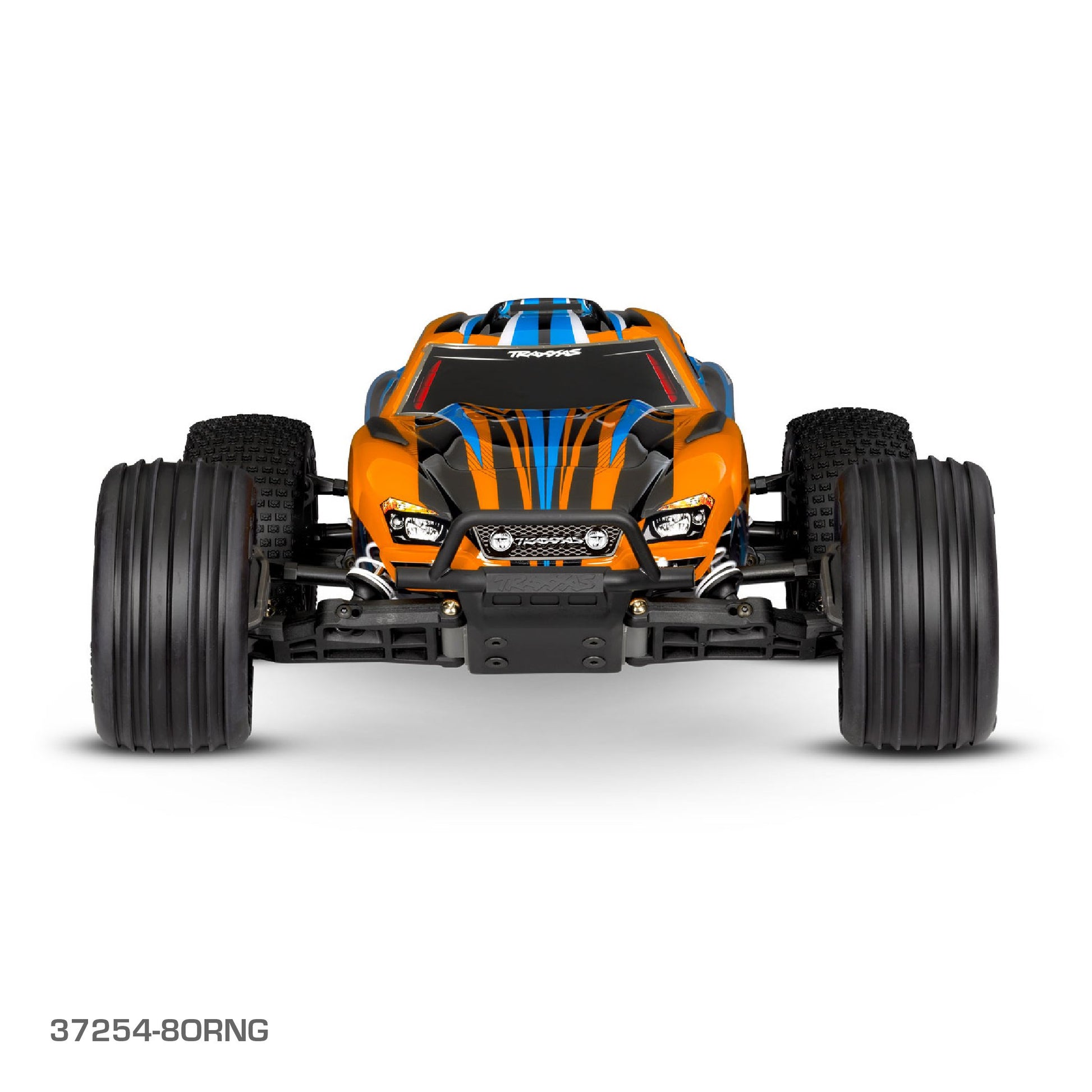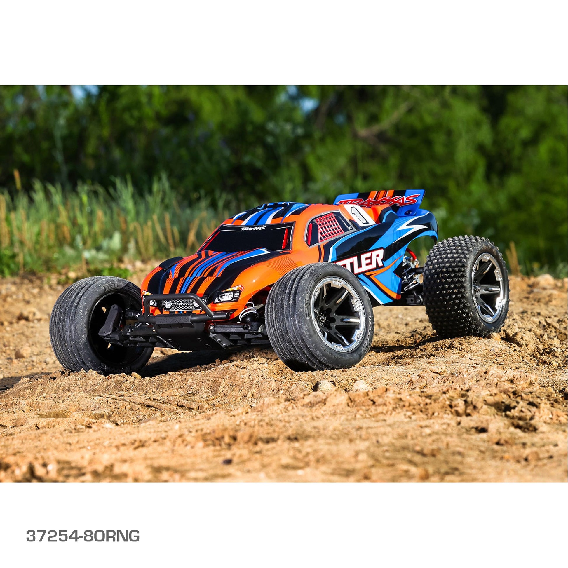 Traxxas Rustler® sits low and wide for maximum high-speed stability, with fast reflexes and an agile feel not found on other trucks. New factory-installed heavy duty suspension components allow Rustler to push the performance envelope to the extreme with next-level durability. Rustler delivers power-sliding, full-throttle fun and a blistering 35+ mph top speed in a Ready-to-Race® package backed by Traxxas legendary innovation.